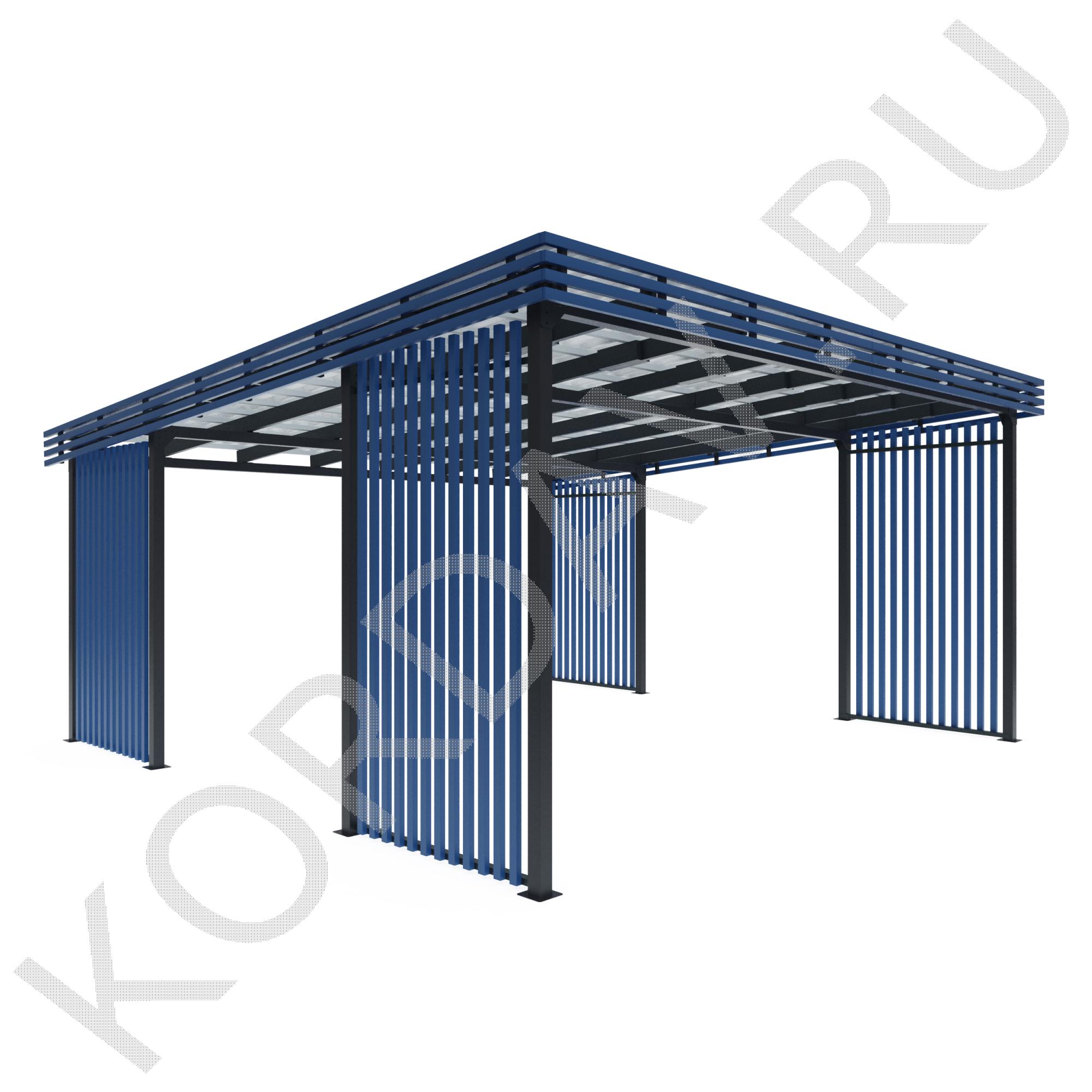 Боковые стороны навеса выполнены из прямоугольных стальных труб 60×40 мм, образующих вертикальные решётки размером 1800×2970×100 мм (высота × длина × глубина).